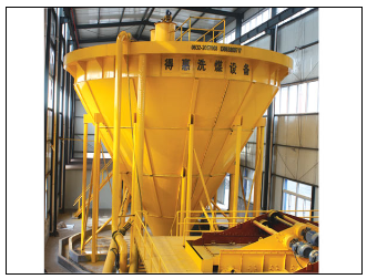 ※原煤与介质由泵同时切向给进,用一套悬浮液系统一次分选出精煤、中煤和矸石三种产品。工艺系统简单可靠。