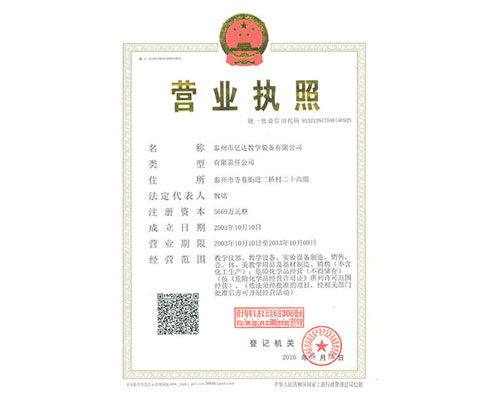 泰州市亿达教学装备有限公司是一家集中、小学教学仪器研发、生产、销售、安装、调试服务于一体的专业企业,公司注册资金5669万元,下设泰州市环溪教学仪器供应站作为销售部。我公司是中国教育装备行业协会会员单位、江苏省教育装备行业协会会员单位,并率先通过ISO9001-2008质量管理体系认证、ISO14001-2004环境管理体系认证、GB/T28001-2001职业健康安全管理体系认证。   公司起源于八十年代,经过亿达人三十多年不懈的努力与追求,我公司已发展成为一家技术力量雄厚、生产设备齐全、售后服务完善的优秀企业。公司产品销往全国各地,以品种齐全、质量上乘、按时交货和完善的售后服务赢得了用户的一致好评,并连续获得国家和省、市级相关部门授予的多项荣誉,国家级的有“全国教学设备十佳名优品牌”、“全国质量信得过产品”、“质量信誉双保障示范...... [ 查看详情 ]